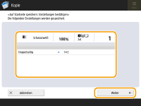 Wenn Sie <Ein> für <Bestätigungsanzeige bei Rückruf anzeigen> und <Vorgang für Rückruf starten (Vorgang startet, wenn die Taste betätigt wird.)> auswählen, wird der Kopiervorgang gestartet, wenn Sie im Bestätigungsbildschirm <Ja> auswählen.