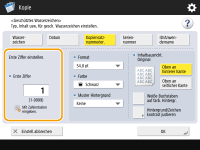Die Einstellung für <Hintergrund/Zeichen kontrast justieren> wird nach Beendigung des Auftrags gelöscht. Wenn Sie die gleichen Einstellungen für den nächsten Kopierauftrag verwenden möchten, geben Sie die Einstellungen erneut ein.