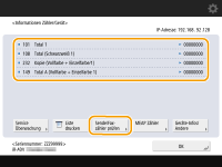 (Informationen Zähler/Gerät) oder die Taste [Informationen Zähler/Gerät] (bei Modellen mit einem aufrechten Bedienfeld).![]() (Die auf dem Bildschirm angezeigten Elemente können sich je nach Modell und Optionen unterscheiden.) |