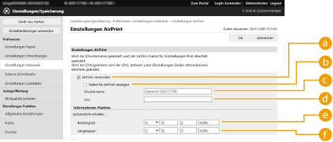 Wenn Sie sich mit Administratorrechten anmelden, können Sie auch die AirPrint-Einstellungen über die Seite für AirPrint ändern.