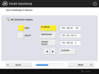 Legen Sie die Einstellungen für die Netzwerkverbindung fest. ![]() ![]() Drücken Sie <Ein> bei <IPv4 verwenden> oder <IPv6 verwenden> und anschließend <Weiter>. Sie können auch IPv4 und IPv6 verwenden. Wenn Sie <Aus> für <IPv4 verwenden> und <IPv6 verwenden> und dann <OK> drücken, überspringen Sie die Netzwerkeinstellungen und fahren Sie mit Schritt 9 fort. ![]() Wenn Sie <Ein> für <IPv4 verwenden> wählen, legen Sie die folgenden Einstellungen fest. ![]() Um die IP-Adresse automatisch abzurufen, drücken Sie <DHCP> oder <Auto IP> und anschließend <Weiter> oder <OK>. Um die IP-Adresse manuell festzulegen, löschen Sie die Auswahl für <DHCP> oder <Auto IP>, drücken Sie <IP-Adresse>, <Subnetmaske> und <Gateway Adresse>, um die jeweiligen Werte einzugeben, und drücken Sie anschließend <Weiter> oder <OK>. Weitere Informationen zu den IPV4-Adresseinstellungen finden Sie unter Einstellen einer IPv4-Adresse. ![]() Wenn Sie <Ein> für <IPv6 verwenden> wählen, legen Sie die folgenden Einstellungen fest. ![]() Drücken Sie <Ein>, um die zustandslose Adresse zu verwenden, bzw. <Aus> um die zustandslose Adresse nicht zu verwenden, und anschließend <Weiter>. Weitere Informationen zu den IPV6-Adresseinstellungen finden Sie unter Einstellen einer IPv6-Adresse. ![]() Nachdem Sie die zustandslose Adresse angegeben haben, legen Sie die folgenden Einstellungen fest. ![]() Drücken Sie <Ein>, um die manuelle Adresse zu verwenden, bzw. <Aus> um die manuelle Adresse nicht zu verwenden, und anschließend <Weiter>. Um die manuelle Adresse zu verwenden, drücken Sie <Manuelle Adresse>, <Präfixlänge> und <Standardrouter-Adr.>, um die jeweiligen Werte einzugeben. ![]() Nachdem Sie die manuelle Adresse angegeben haben, legen Sie die folgenden Einstellungen fest. ![]() Drücken Sie <Ein>, um DHCPv6 zu verwenden, oder <Aus>, um DHCPv6 nicht zu verwenden, und drücken Sie dann <OK>. | |