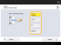 1 | Pulse <Sobre>. El tipo de papel de sobres no se puede seleccionar en la pantalla de detalles de <Tipo de papel>. Para seleccionar el tipo de papel de sobres, registre el tipo de papel en <Guardar papel favorito (bandeja multiuso)> y, a continuación, pulse <Papel favorito> en el paso 2 el botón en el que se ha registrado el tipo de papel de sobres <Aceptar>. Registrar el tamaño y el tipo de papel de uso frecuente para la bandeja multiuso |