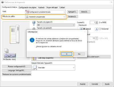 ![]() | Puede establecer una hora para iniciar la impresión, que resultará útil al imprimir grandes cantidades de documentos por la noche, etc. |