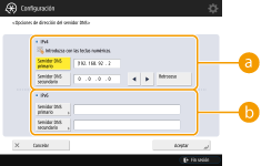 2 | Configure las opciones necesarias. En función del entorno, introduzca una dirección IP del servidor DNS. ![]() <IPv4>Pulse <Servidor DNS primario> e introduzca una dirección IPv4 del servidor DNS. Si hay un servidor DNS secundario, introduzca la dirección IP del mismo. Si no configura ningún servidor DNS secundario, introduzca "0.0.0.0". <IPv6>Pulse <Servidor DNS primario> e introduzca una dirección IPv6 del servidor DNS. No puede introducir direcciones que empiecen por "ff" (dirección multidifusión), direcciones que contengan únicamente ceros ni direcciones de enlaces locales. Si hay un servidor DNS secundario, introduzca la dirección IP. No podrá introducir direcciones que empiecen por "ff" (dirección multidifusión), direcciones que contengan únicamente "0" o direcciones de enlaces locales. Esta columna se puede dejar en blanco. |