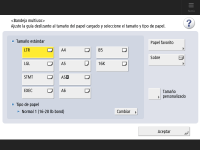 Cuando el papel se ha insertado completamente, aparece la pantalla para especificar el tamaño y el tipo de papel.