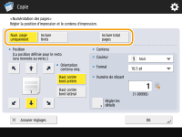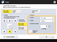 Les numéros de jeux de copies sont imprimés sur toutes les pages copiées. Les numéros de jeux de copies peuvent être imprimés avec des dates ou du texte.<Régl. options numérot. jeux de copies> Le texte pour la <Numérotation des pages> et le <Filigrane> peut également être sélectionné à partir du texte qui a été enregistré dans <Enreg. caractères pour Num. pgs/Filigrane>. Si vous sélectionnez deux options parmi <Numérotation des pages>, <Filigrane>, <Date d'impression> et <Numérotation jeux copies> pour imprimer dans la même position, un message vous demandant si vous voulez imprimer avec ces réglages s'affiche lorsque vous appuyez sur (Start).Si vous définissez <Régl. options numérot. jeux de copies> sur <Oui>, les réglages que vous pouvez modifier changent comme suit. <Régl. options numérot. jeux de copies> Vous ne pouvez plus sélectionner <Toute la surface> et <Numéros à 5 endroits> comme positions d'impression dans le mode Numérotation des jeux de copies. Les tailles de numéro du mode Numérotation des jeux de copies deviennent <10,5 pt>, <12,0 pt> et <14,0 pt>. |
