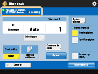 Mostra l'estat de l'opció, com la mida de paper per imprimir i el nombre d'impressions. Assegureu-vos de confirmar les opcions per imprimir correctament. Per modificar les opcions, premeu el botó que hi ha a sota de la secció de la pantalla. Per canviar el nombre d'impressions, introduïu el nombre amb les tecles numèriques.