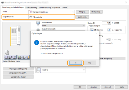 Vælg [Tilbagehold] fra [Outputmetode], og klik på [Ja].