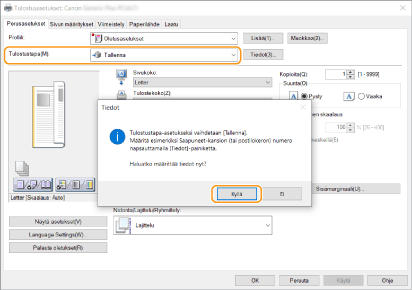 Valitse [Tallenna] kohdassa [Tulostustapa] ja valitse sitten [Yes].
