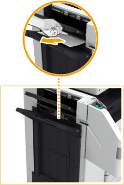 Als er papier uit de uitvoer van blad B komt, trekt u het papier voorzichtig naar buiten in de richting van de pijl.