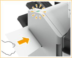 Quando a máquina deteta o conjunto de papel, o botão Agrafar começa a piscar e é efetuado o agrafamento automático.