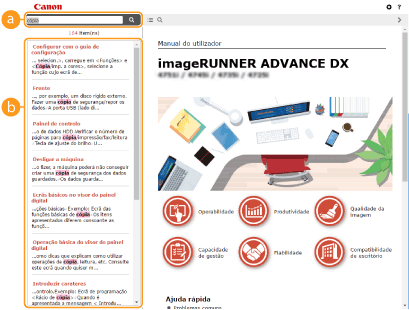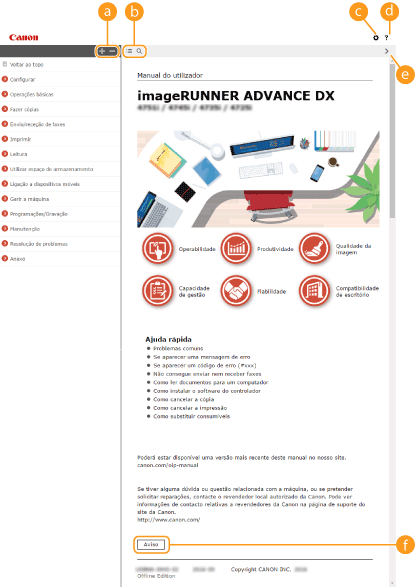 Clique para visualizar informações sobre como ver o Manual do utilizador, como efetuar uma procura e outras informações.