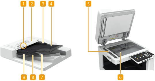 Não coloque objetos na área de saída de originais. Se o fizer, poderá danificar os originais.