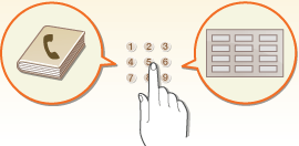 Pode gravar destinos utilizados frequentemente em teclas de marcação por memórias telefónicas diretas de forma a simplificar as operações. As teclas de marcação por memórias telefónicas diretas com destinos gravados são apresentadas no visor do painel digital, o que lhe permite procurar e especificar os destinos rapidamente com um único botão. Gravar um destino numa tecla de marcação por memórias telefónicas diretas