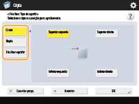 Para agrafar na secção em que o papel é dobrado ao meio, selecione <Finalizaragrafar>. Dependendo do seu modelo e das opções instaladas, poderá incluir uma capa ou alterar a posição de dobragem. Ao cortar as extremidades das folhas impressas, é possível ajustar a posição de corte.