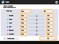 para <Todas cores>. Para programar cada cor separadamente, utilize os botões à esquerda e à direita de cada cor. Quando o ajuste estiver concluído, carregue em <OK>.