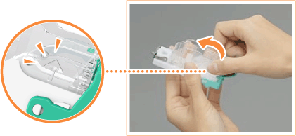 Introduza a placa saliente que se encontra na parte da frente da caixa de agrafos na cartridge de agrafos e baixe a caixa de agrafos para a colocar na cartridge de agrafos.