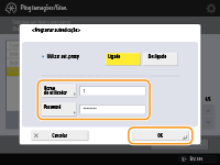 Para utilizar a função de autenticação do servidor proxy, carregue aqui e configure as informações de autenticação. No ecrã apresentado, carregue em <Ligado>, introduza o nome de utilizador e a palavra-passe a utilizar na autenticação do proxy e carregue em <OK>.