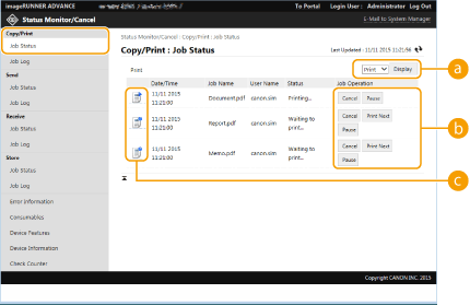Inicie a Remote UI (Interface Remota) [Status Monitor/Cancel]  [Job Status] em [Copy/Print]