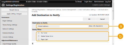 Clique em [Device Management] [E-Mail Notification Settings]  [Add Destination to Notify...].