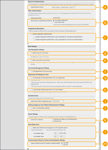 Selecione a caixa de verificação correspondente a [Use the user authentication function] e especifique as programações necessárias.