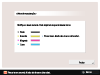 O ecrã de aviso aparecerá novamente quando tiver pouco toner de outra cor, se <Mostrar mensagem de erro de toner restante> estiver programado para <Ligado>.