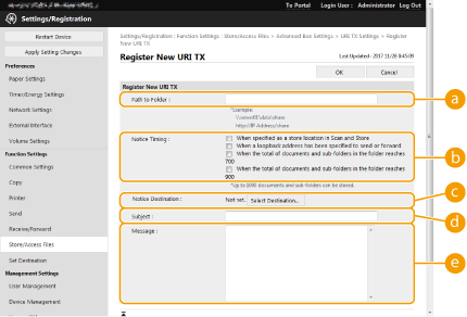 A notificação é enviada sempre que um ficheiro é guardado na pasta especificada na Caixa avançada a partir de um endereço de loopback (um endereço que indica que esta máquina está numa rede) utilizando a função de envio ou reencaminhamento. No entanto, a notificação não é enviada quando um ficheiro é guardado numa subpasta ou quando uma pasta é adicionada a uma subpasta. Especifique um endereço de loopback quando utilizar o Caixa avançada da máquina como o destino de <Ler e Enviar> ou <Programações de encaminhamento>. Gravar destinos no livro de endereços