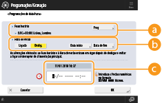 Se tiver alterado a programação de <Fuso horário> ou de <Hora de verão>, tem de reiniciar a máquina desligando-a. Carregue no interruptor de alimentação para desligar a máquina ( Desligar a máquina). Quando tiverem passado 10 segundos ou mais depois de o indicador de alimentação principal se apagar, ligue novamente a máquina ( Ligar a máquina).