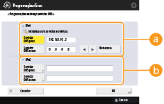 O servidor DNS é um computador que converte os nomes dos dispositivos (nomes de domínio) na Internet em endereços IP. Existem muitos servidores DNS na Internet a nível mundial. Cooperam uns com os outros para fazerem a correspondência entre os nomes de domínio e os endereços IP. Esta secção descreve os passos para programar o endereço do servidor DNS, o nome do anfitrião e o nome do domínio da máquina. Também pode programar a máquina para que uma atualização automática seja efetuada se a correspondência entre o nome do anfitrião e o endereço IP for alterada. Se programar o DNS num ambiente IPv6, confirme se os endereços IPv6 podem ser utilizados (Programar um endereço IPv6). Além disso, pode efetuar a correspondência com um endereço IP adquirindo o nome do anfitrião através de um servidor DHCP sem introduzir manualmente o nome do anfitrião da máquina.