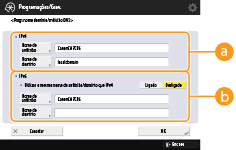 Para configurar as mesmas programações utilizadas para IPv4 no que diz respeito ao nome mDNS, carregue em <Ligado> para <Utilizar o mesmo nome mDNS que o utilizado em IPv4 mDNS>. Para utilizar programações diferentes, carregue em <Nome mDNS> e introduza um nome mDNS à sua escolha utilizando carateres alfanuméricos.