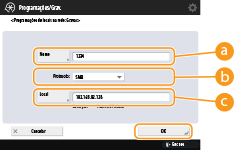 <Local> aparece se selecionar <SMB> e <Nome do anfitrião> aparece se selecionar <WebDAV> na programação do protocolo.