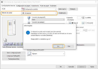 Selecione [Armazenar] de [Método de Saída] e clique em [Yes].