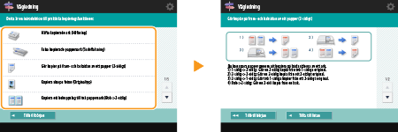 Tryck på <Vägledning> för att visa en skärmbild som ger en introduktion till vad du kan göra med funktionerna i maskinen samt tips för att kopiera, scanna etc. Visa den här skärmbilden när du vill lära dig mer om vilka funktioner som finns och hur du kan använda dem.