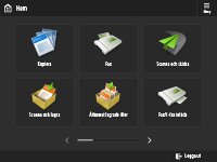 (Inställningar/Registrering) för att visa skärmbilden <Inställningar/Registrering>. Tryck på den här knappen först för att göra förändringar för varje inställning, som t.ex. pappersinställningar, visningsinställningar och nätverksinställningar. På den här skärmbilden kan du också registrera mottagare, som t.ex. e-postadresser och faxnummer.