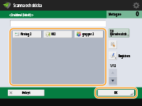 <Orig. innehållsriktning> välj <Övre kant mot bortre kant> eller <Övre kant mot sidkant> enligt originalets orientering tryck på <OK>.Ange flera mottagare inklusive faxGenom att sätta <Aktivera fax i scanningsoch sändfunktion> till <På> kan du ange faxmottagare på skärmbilden med grundläggande kopieringsfunktioner (<Visa faxfunktion>). Den här inställningen är användbar för ange flera mottagare inklusive fax, t.ex. när du sparar en kopia av skickade fax i en filserver.