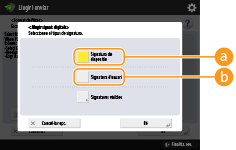 <Afegir signat. digitals>: si ja hi ha un camp de signatura al PDF, s'hi pot afegir una signatura digital. (Només apareix si se selecciona <Acrobat 6.0 i posterior/128 bits RC4>, <Acrobat 7.0 i posterior/128 bits AES>, <Acrobat 9.0 i equivalent/256 bits AES> o <Acrobat 10.0 i equivalent/256 bits AES>.)
