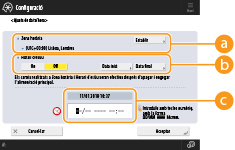 Per establir l'horari d'estiu, premeu <On> i establiu la data i l'hora per a <Data inici> i <Data final>. Per establir la data, especifiqueu el dia de la setmana i la setmana del mes.