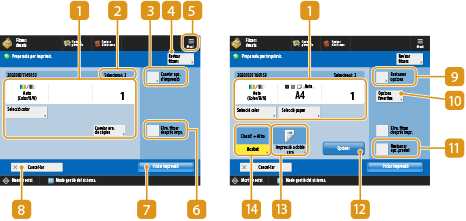 Mostra l'estat de l'opció, com la mida de paper per imprimir i el nombre d'impressions. Assegureu-vos de confirmar les opcions per imprimir correctament. Per modificar les opcions, premeu el botó que hi ha a sota de la secció de la pantalla. Per canviar el nombre d'impressions, introduïu el nombre amb les tecles numèriques.
