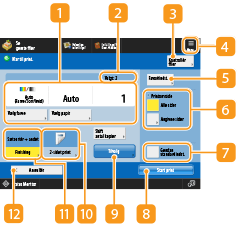 Viser indstillingsstatus, som f.eks. papirformatet, der skal printes på, og printantallet. Sørg for at tjekke indstillingerne for at printe korrekt. For at ændre indstillingerne skal du trykke på knappen under displayafsnittet. For at ændre antallet af print skal du indtaste antallet med taltasterne.