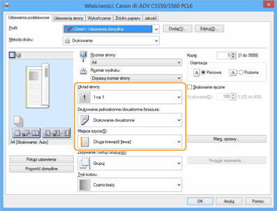 [Kolejność stron] [Drukowanie jednostronne/dwustronne/broszura] [Miejsce szycia].