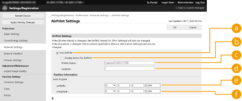 Můžete zaregistrovat údaje, včetně názvu zařízení a instalačního umístění, pomocí nichž lze zařízení identifikovat. Nastavení nutná pro službu AirPrint lze nakonfigurovat vzdáleně pomocí Remote UI (Vzdálené UR).