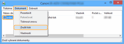 Nemůžete-li najít dokument, který chcete zrušit, tento dokument je již odeslaný do stroje. V takovém případě nemůžete tisk na počítači zrušit.
