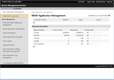 Du kan tjekke antallet af installerede applikationer, og den lagerenhed der anvendes. Administration af MEAP-applikationer