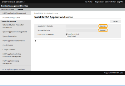 Inden installation af en MEAP-applikation skal du hente "licensfilen" med en computer. Når du har hentet licensfilen, skal du vise SMS'en fra Remote UI (Brugerinterface til fjernbetjening) for at installere MEAP-applikationen.