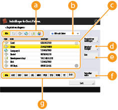 Vælg (e-mail), (fax), (I-fax), (file) eller  (gruppe) for at filtrere de modtagere, der vises i adresselisten (). Tryk på <Alle> for at vise alle registrerede modtagere.