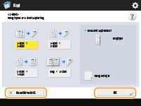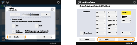 Endvidere vises knapper, som f.eks. <Annullér>, der annullerer indstillingen og vender tilbage til det forrige skærmbillede, <Næste>, der anvender indstillingen for at fortsætte til det næste skærmbillede, <Tilbage>, der vender tilbage til den forrige indstillingsskærm, og <Luk>, der lukker det aktuelt viste skærmbillede.
