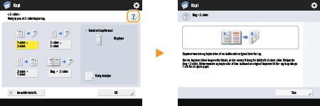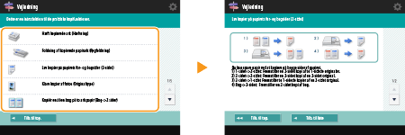 Tryk på <Vejledning> for at vise et skærmbillede, der fortæller, hvad du kan udføre med funktionerne på maskinen, samt tips til kopiering, scanning mv. Vis dette skærmbillede, når du vil lære mere om de tilgængelige funktioner, og hvordan du bruger dem.