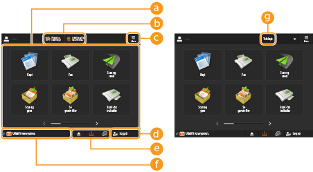 Disse knapper gør det muligt at åbne skærmene til de grundlæggende funktioner som f.eks. "Kopi" og "Scan og send".