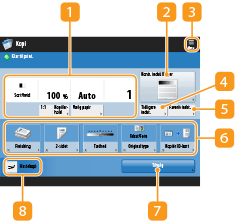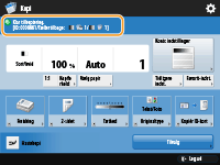 Viser indstillingsstatus, som f.eks. kopiforholdet, papirformatet og kopiantallet. Sørg for at tjekke indstillingerne for at kopiere korrekt. For at ændre indstillingerne skal du trykke på knappen under displayafsnittet.
