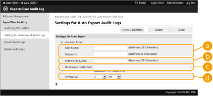 Klik på [Device Management] [Export/Clear Audit Log]  [Settings for Auto Export Audit Logs].
